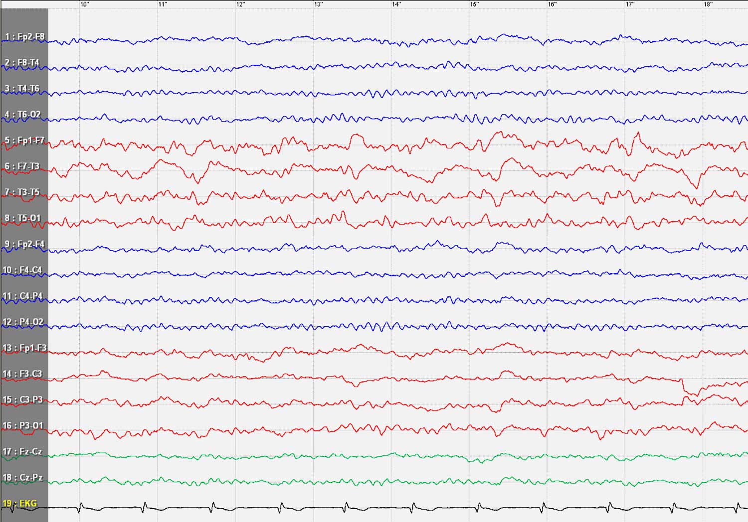 67-letna kobieta po leczeniu operacyjnym guza lewej półkuli mózgu. W prawej półkuli widoczne są fale alfa 9 Hz. W lewej półkuli dominują polimorficzne fale theta, wymieszane z falami delta i niezbyt licznymi falami alfa.