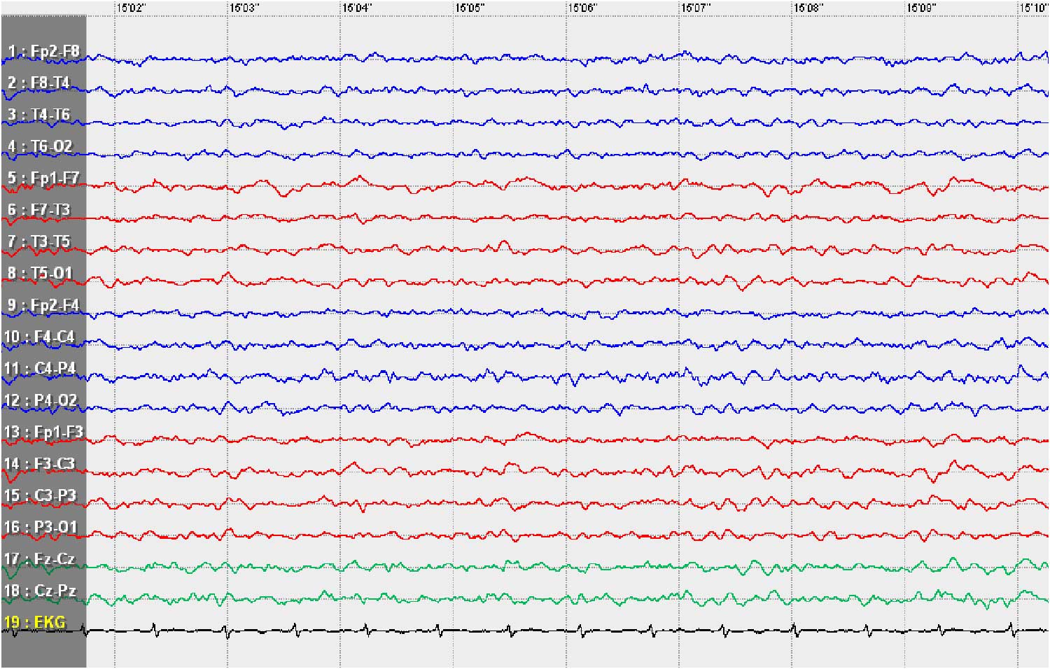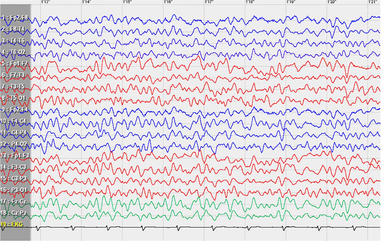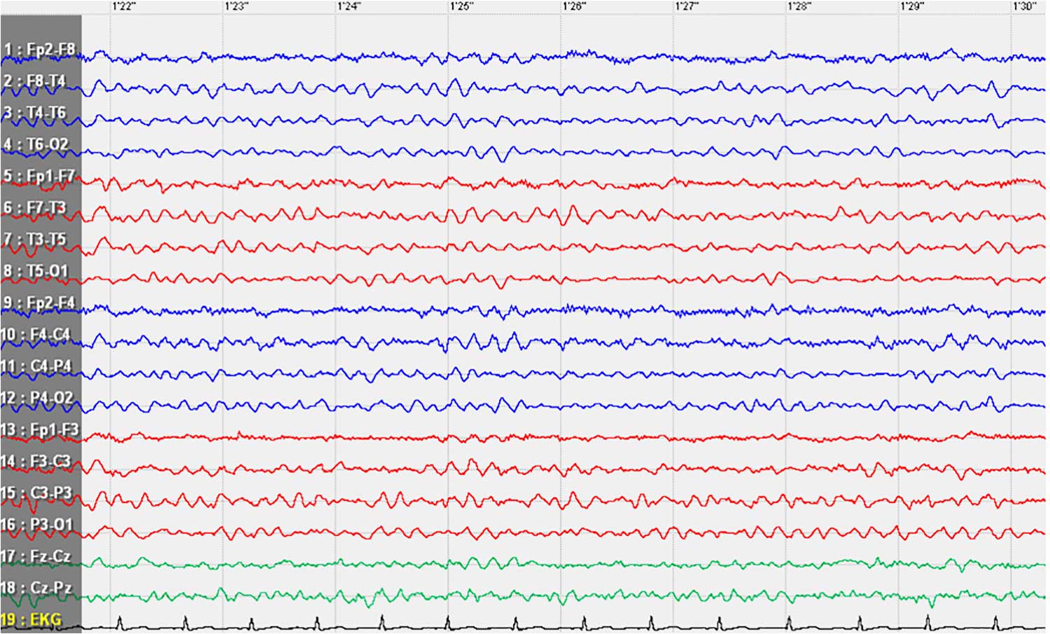 56-letnia kobieta z chorobą neurozwyrodnieniową. Zapis niezróżnicowany przestrzennie, widoczne są fale theta 4-7 Hz oraz niezbyt liczne fale delta 3-4 Hz.