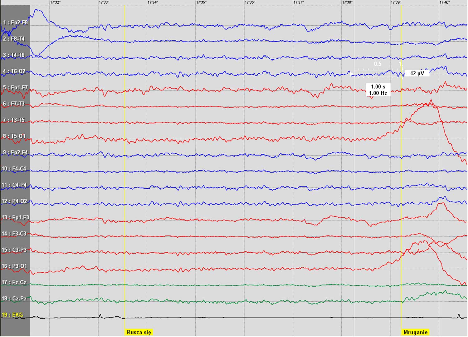 74-letnia kobieta. Obustronne zespoły dwu- i trójfazowych fal ostrych z falą wolną, przeważające po stronie lewej.