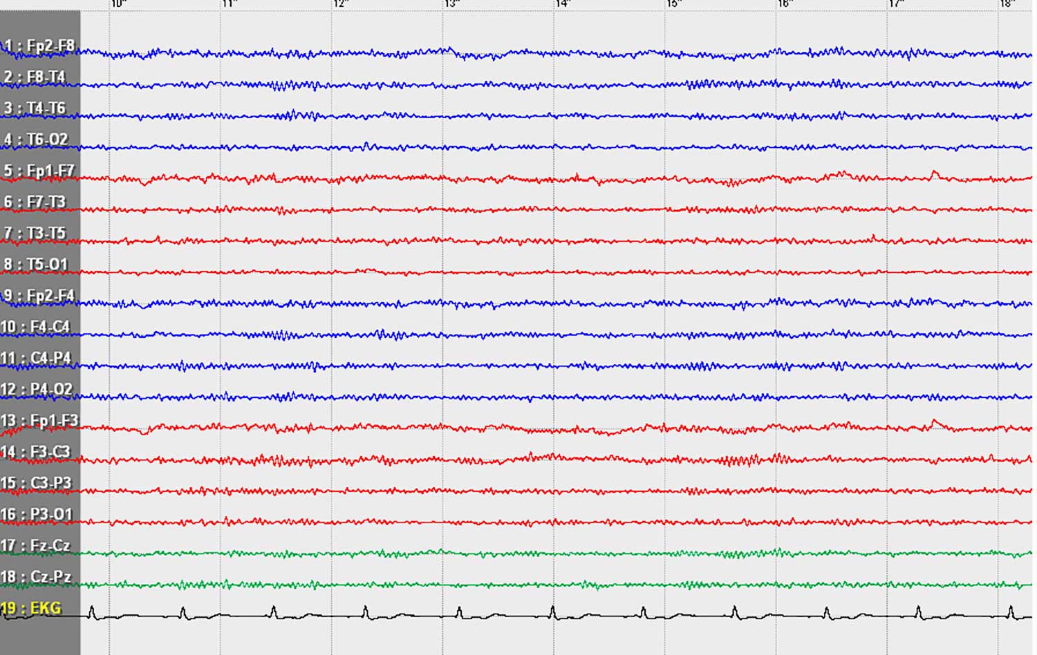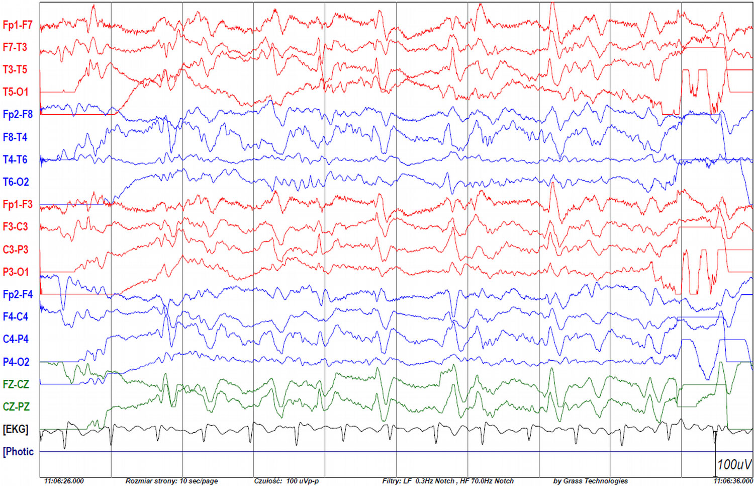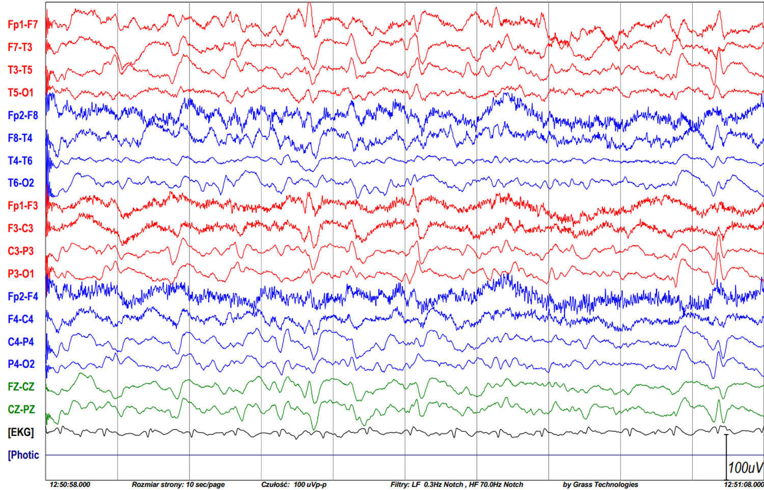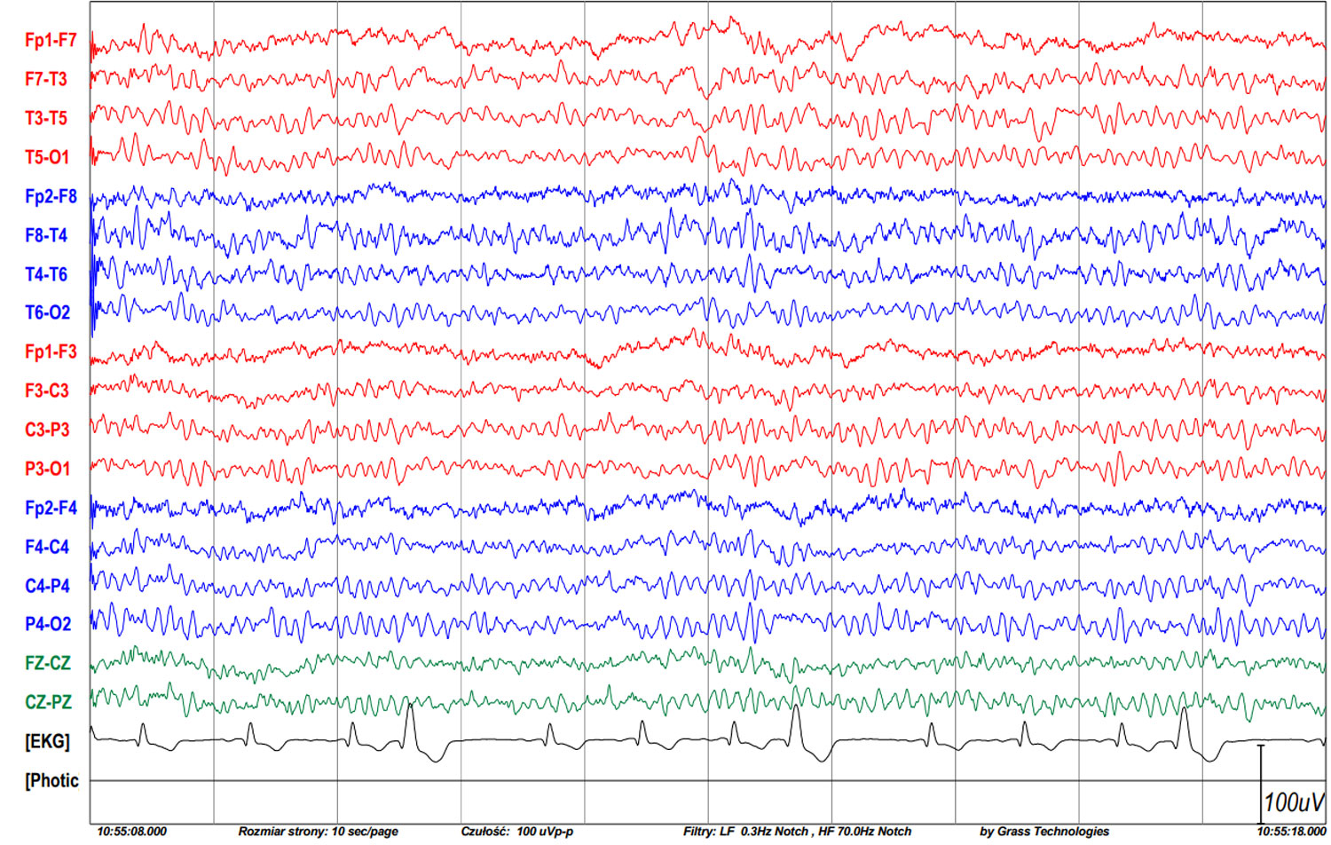 25-letnia kobieta, przyjmująca klonazepam w dawce 6 mg/dobę. We wszystkich odprowadzeniach widoczna jest bardzo obfita, średnionapięciowa czynność szybka, często o układzie wrzecionowatym.