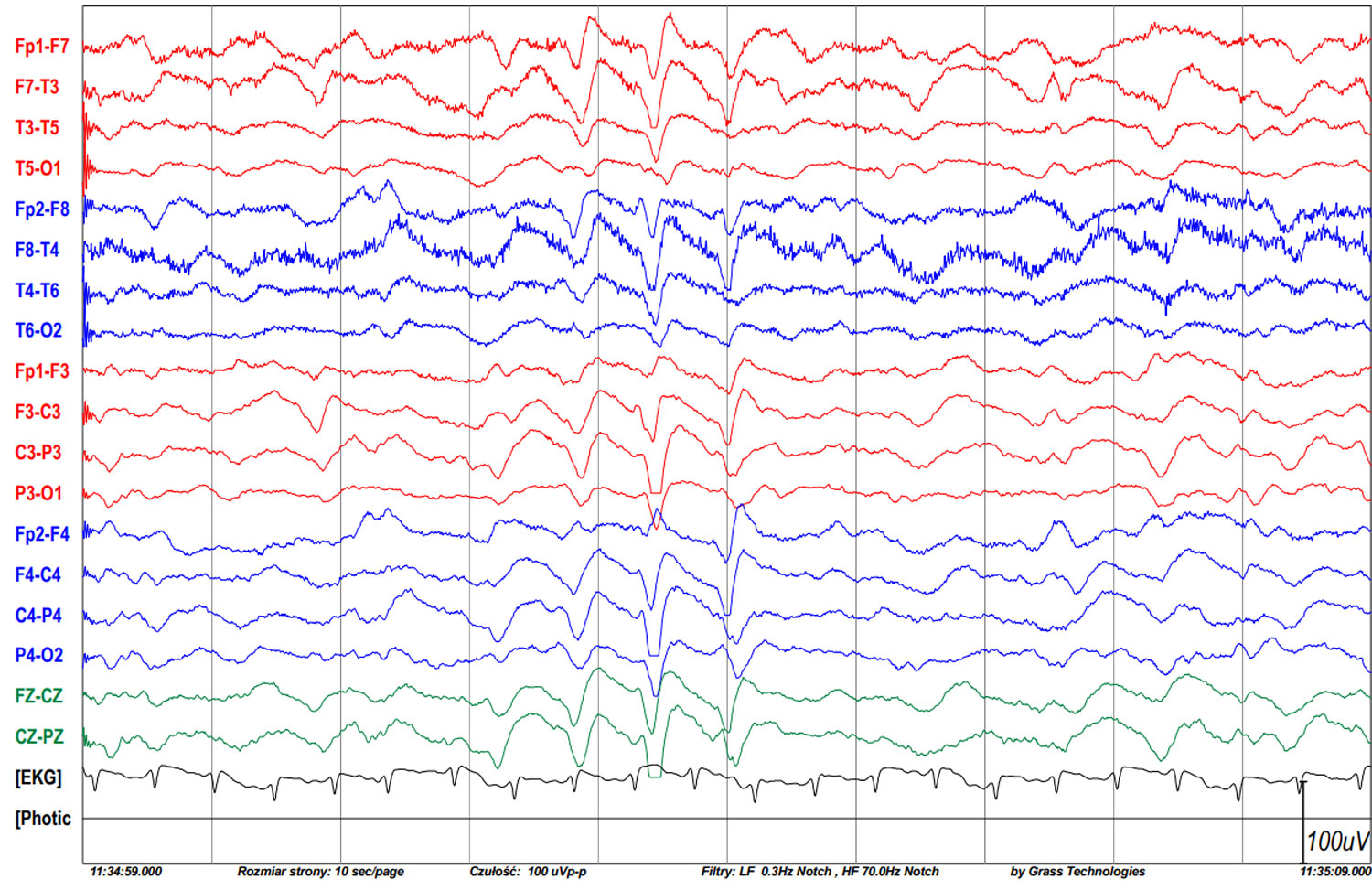 81-letnia kobieta. Obustronne, synchroniczne zespoły dwu- i trójfazowych fal ostrych z falą wolną (ang. periodic sharp wave complexes – PSWCs.
