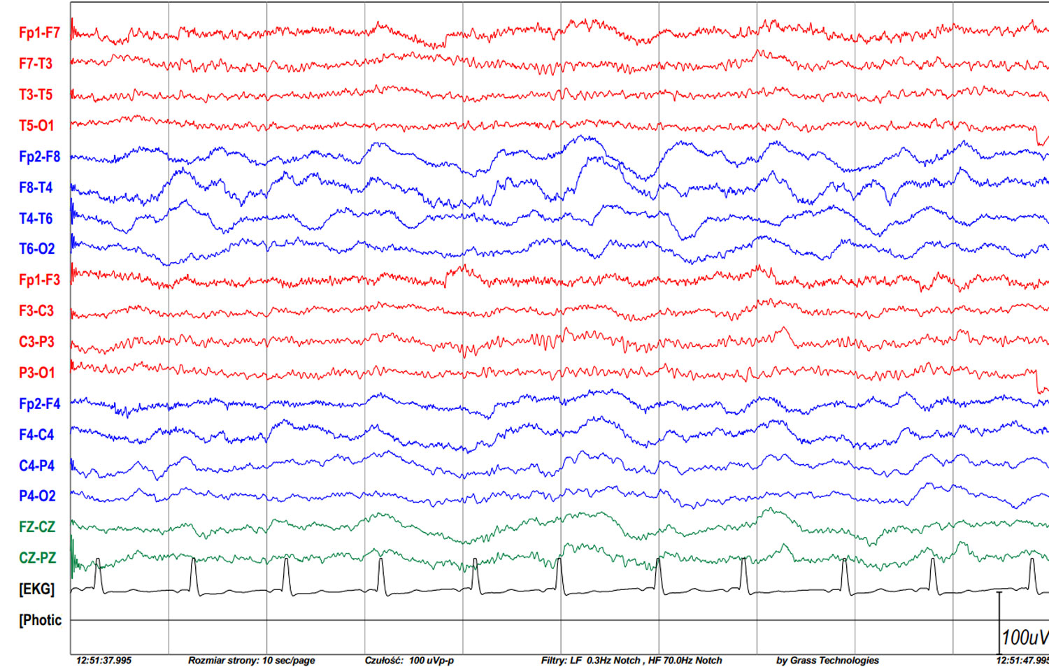 84-letnia kobieta. Fale delta 1-2 Hz dominujące w prawej okolicy czołowo-skroniowej.
